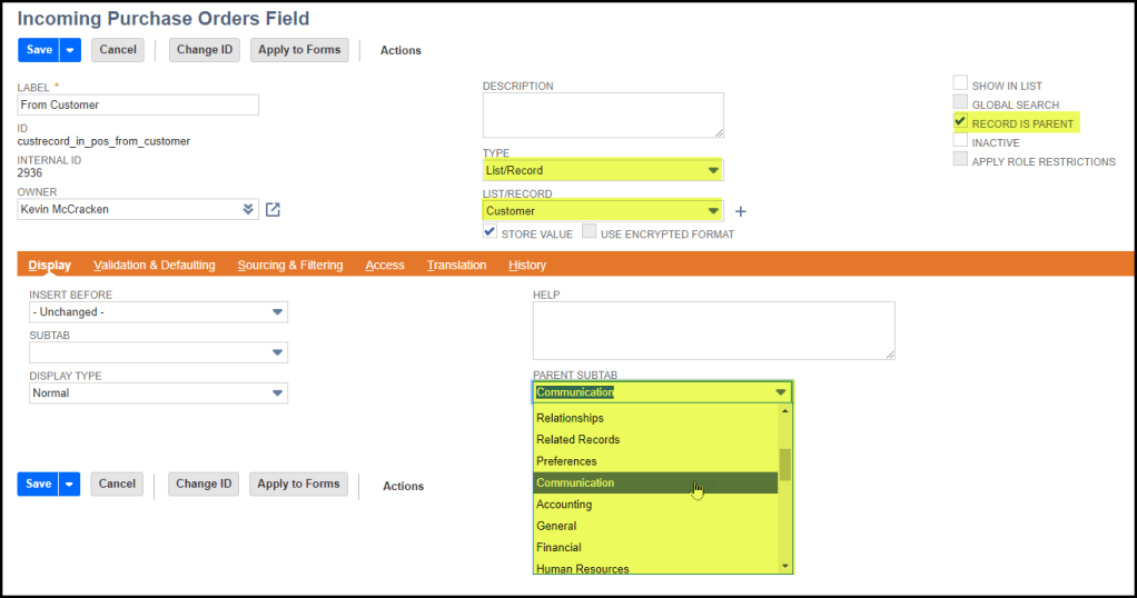 In this scenario, we are dealing with a custom record type called “Incoming Purchase Orders”, emails captured via an email plugin. The custom record type has customer as a parent record. We’d like “Incoming Purchase Orders” sublist to live under the Communications tab of Customers, and be editable.