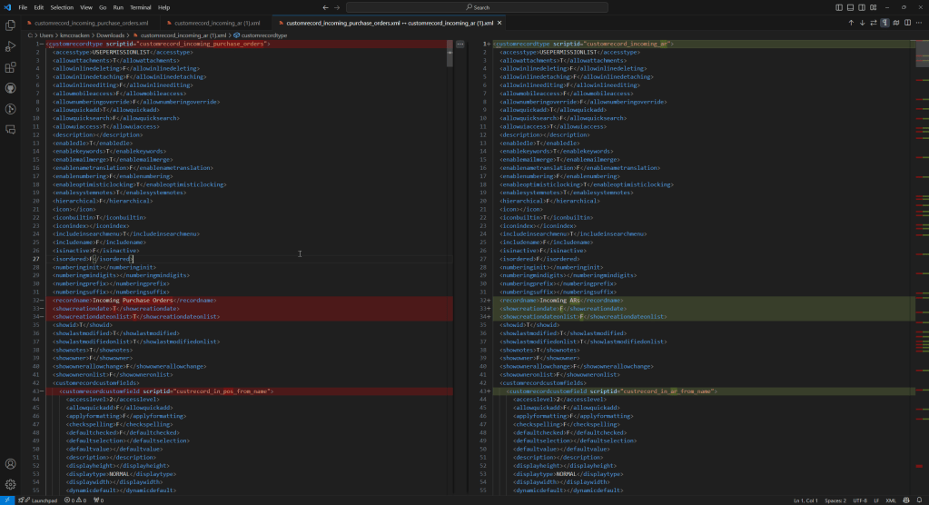 Once you download the two object’s XML representations, you can use any “Diff” program to compare the two files side by side. In my case, I used the compare function in vsCode. WinMerge is another option. I’m sure there are lots of others.