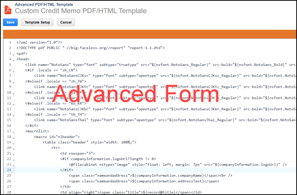 Start by opening your advanced template. It opens in Edit view. You’re looking at Freemarker/HTML code.