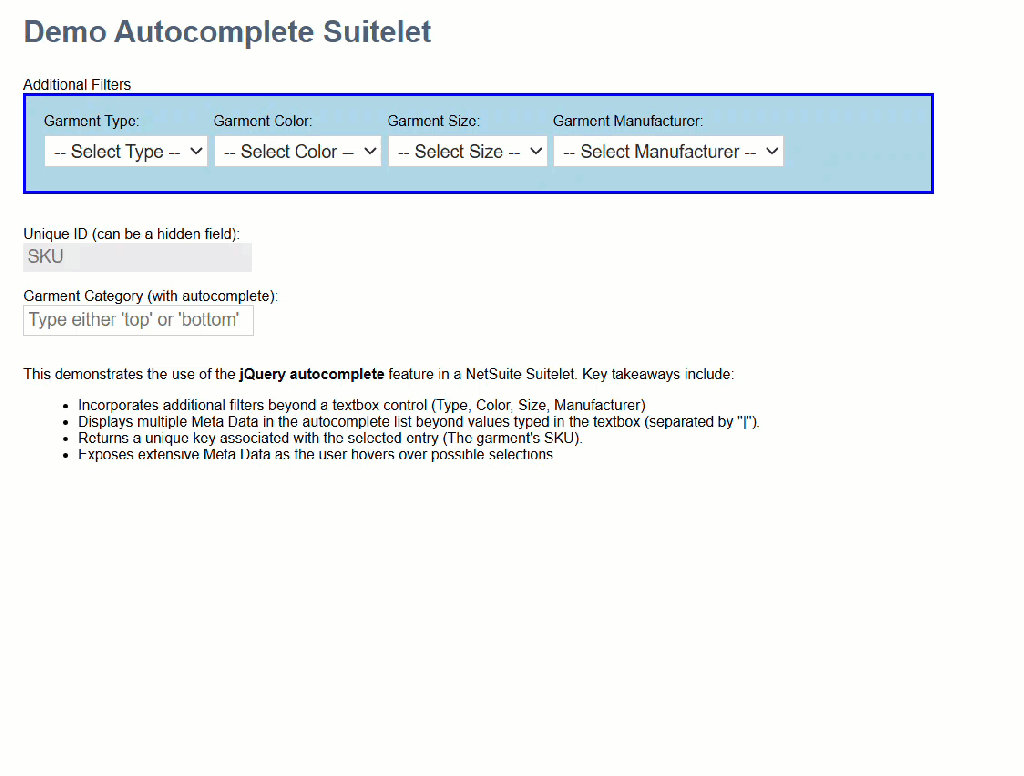This demonstrates the use of the <strong>jQuery autocomplete</strong> feature in a NetSuite Suitelet.