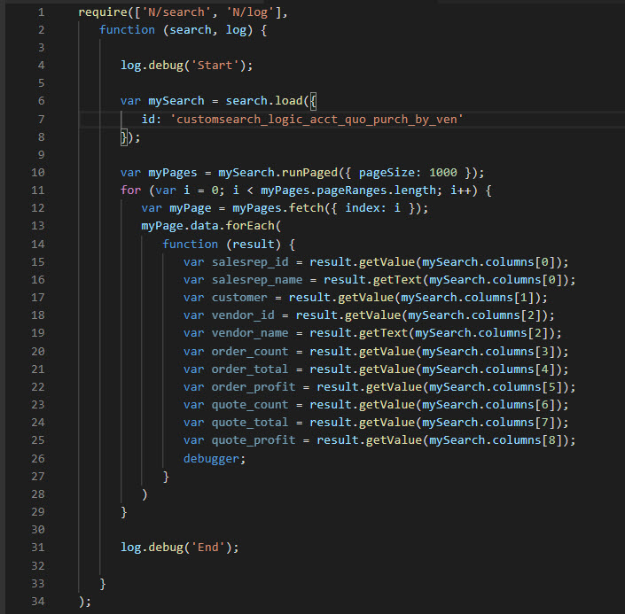 Finally, you’ll need a restlet. My restlet is looking up vendors that match the text in the “whatever” textbox. The minLength property of the autocomplete object shown above tells jQuery AutoComplete to omit calling the Restlet until there is at least 3 characters in the textbox.